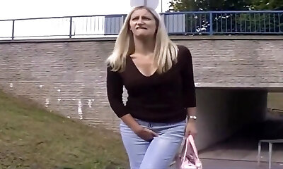 Pale buxom blondie pisses and then sucks a man meat on the river bank